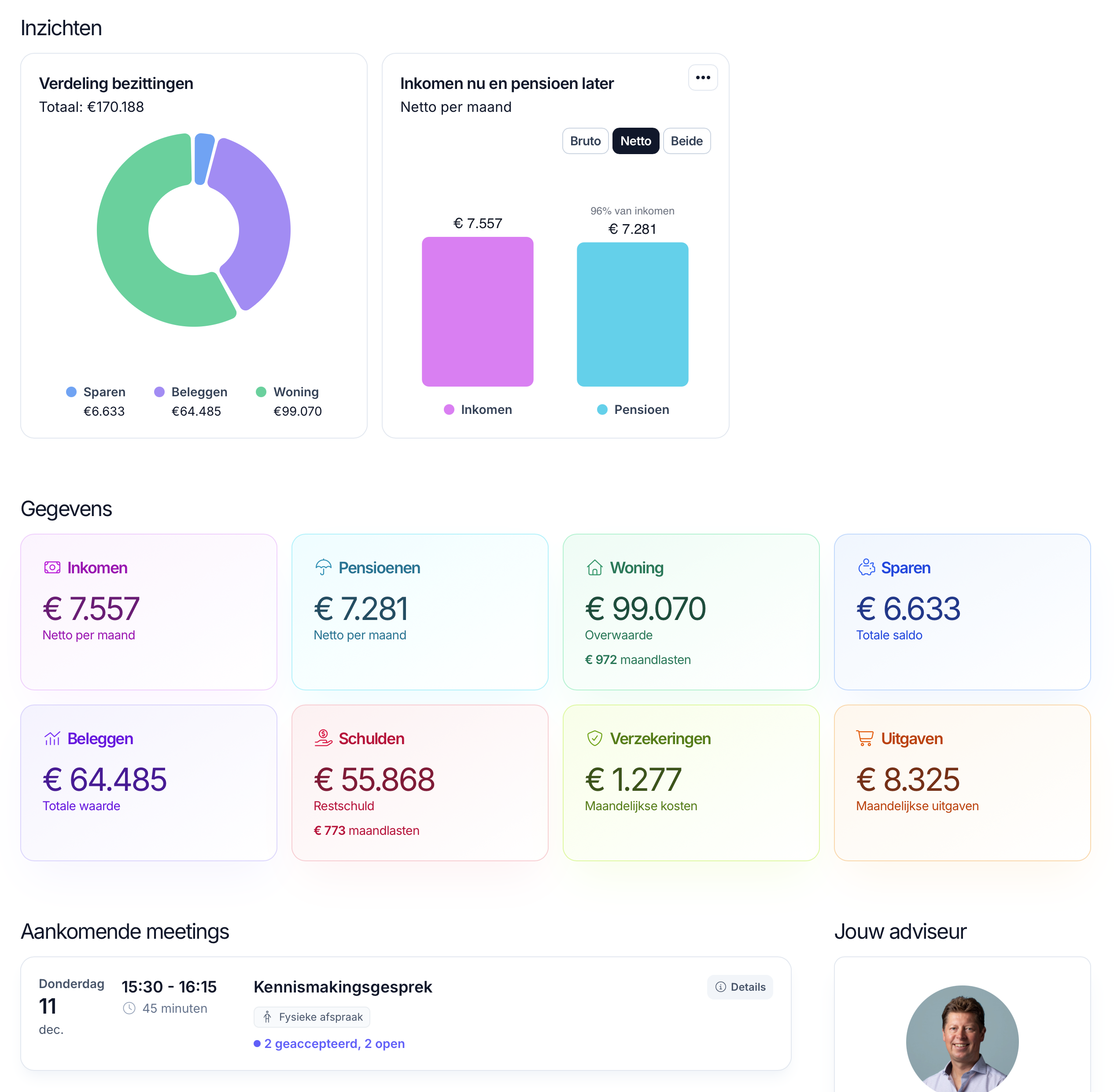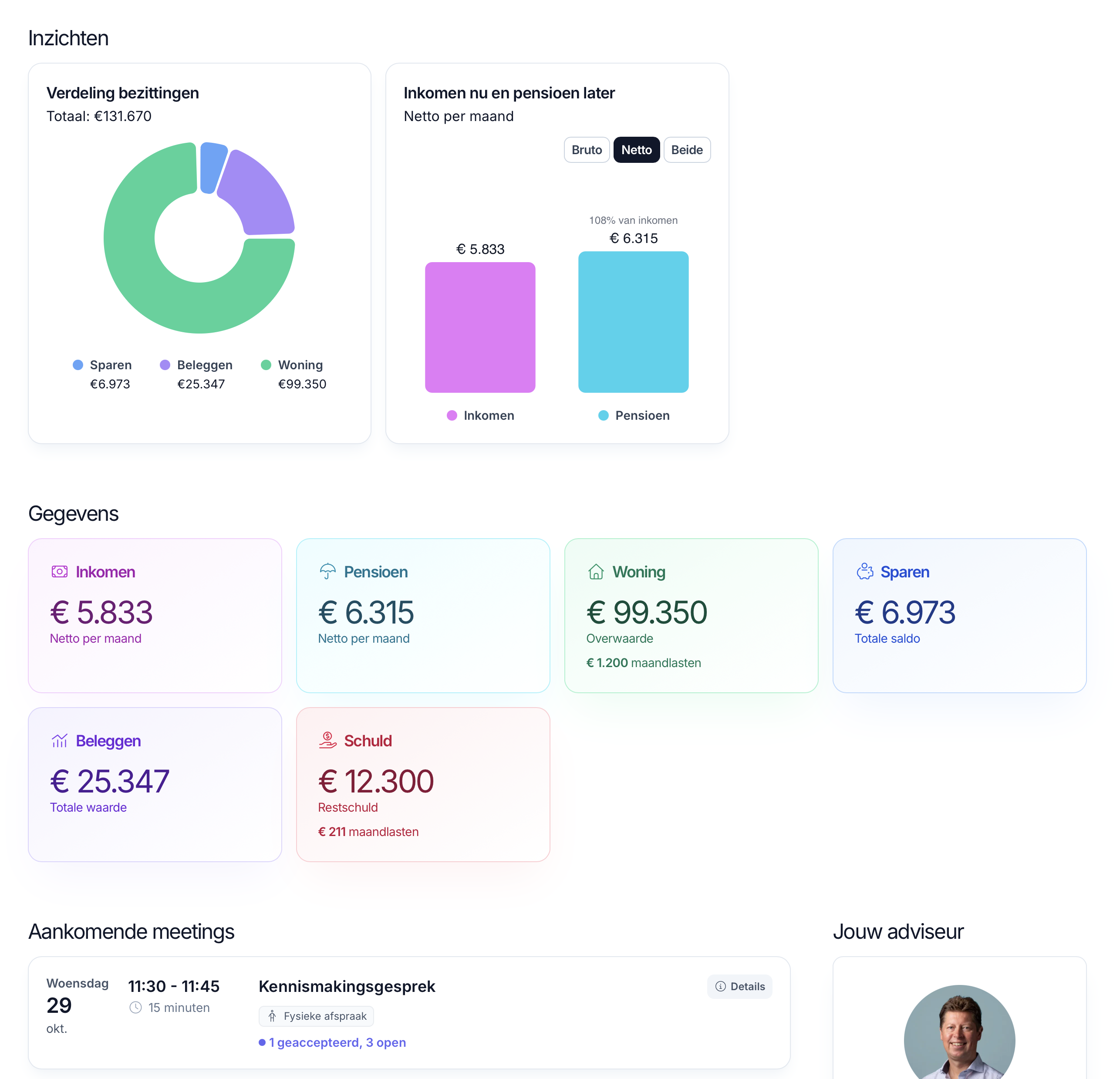 Jouw klanten krijgen toegang tot een strak ontworpen, simpel in gebruik online dashboard. Het vormt de connectie tussen adviseur en klant: het activeert de adviesvraag voor de klant op het juiste moment en stroomlijnt jullie samenwerking.